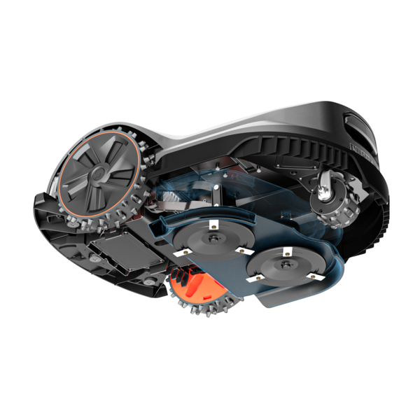 Dva žací disky (35 cm): Pro maximální efektivitu na ploše 3000 m² je X7 vybavena plovoucím žacím ústrojím s dvěma disky, 6 noži a masivním záběrem 35 cm. Vaši zahradu tak poseče v rekordním čase, přičemž se stále dokonale přizpůsobuje nerovnostem terénu.