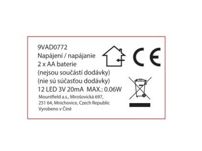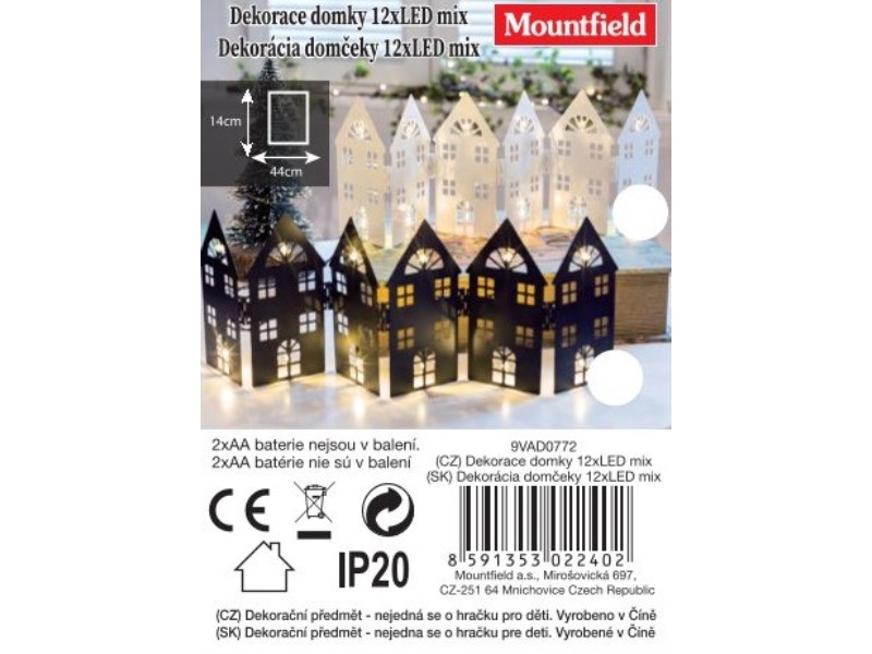 Dekorace kovovcých domečků s 12 LED žárovkami vydávajícími teplé, příjemné světlo. Rozměr celé dekorace je 44 x 14 cm.