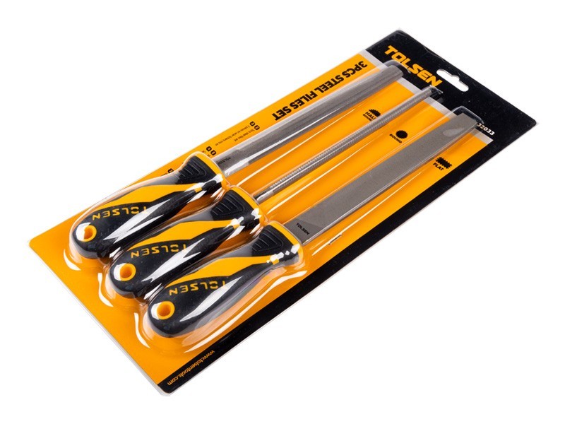 Třídílná sada pilníků o délce 200 mm pro opracování kovových povrchů, zejména železa a oceli. Pracovní části jsou z prémiové oceli uhlíková T12, ergonomická rukojeť z odolného plastu.