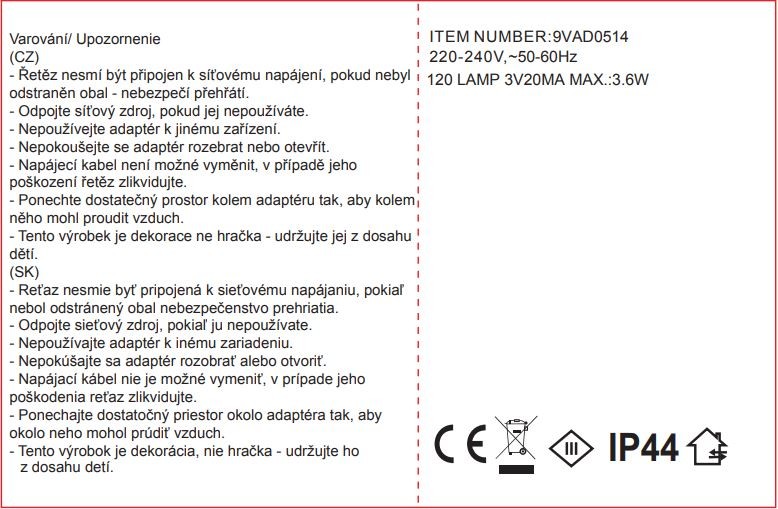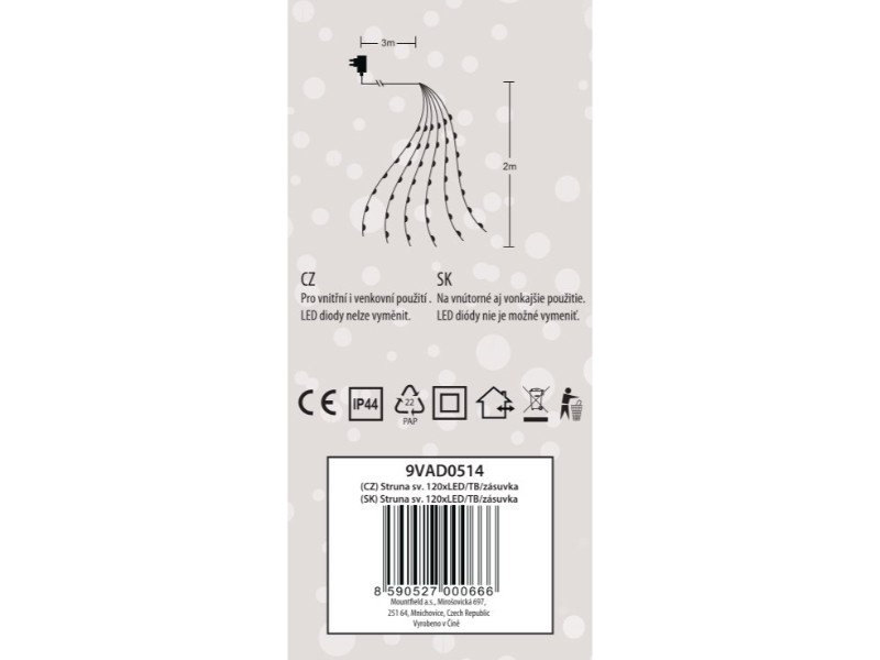 Ozdobná struna s drobnými světýlky 120 LED. Světlo je bílé s teplým podtónem. Je vhodná do interiérů i exteriérů. K zastrčení do zásuvky.