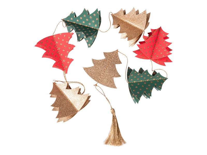 Vytvořte si doma tu pravou sváteční atmosféru s touto girlandou z papírových stromečků. Sedm stromečků v klasických vánočních barvách – zlaté, zelené a červené – je zavěšeno na jemném provázku a každý z nich je zvýrazněn třpytivým pozlaceným okrajem. Girlanda o délce jednoho metru je ideální k zavěšení na stěnu, okno nebo nad krb, kde krásně vynikne a dodá prostoru teplo a kouzlo Vánoc.